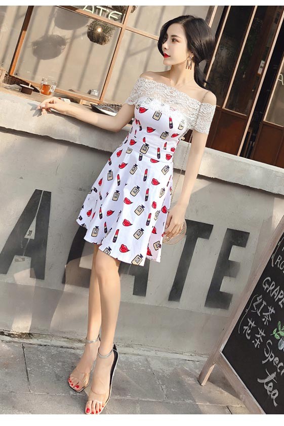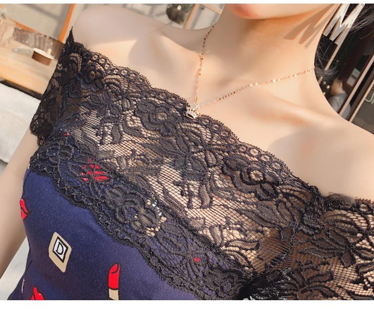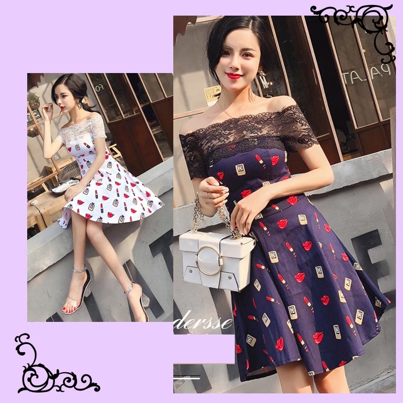 レトロ感のあるストレッチレースデザイン・ベアトッププリントワンピース♪
