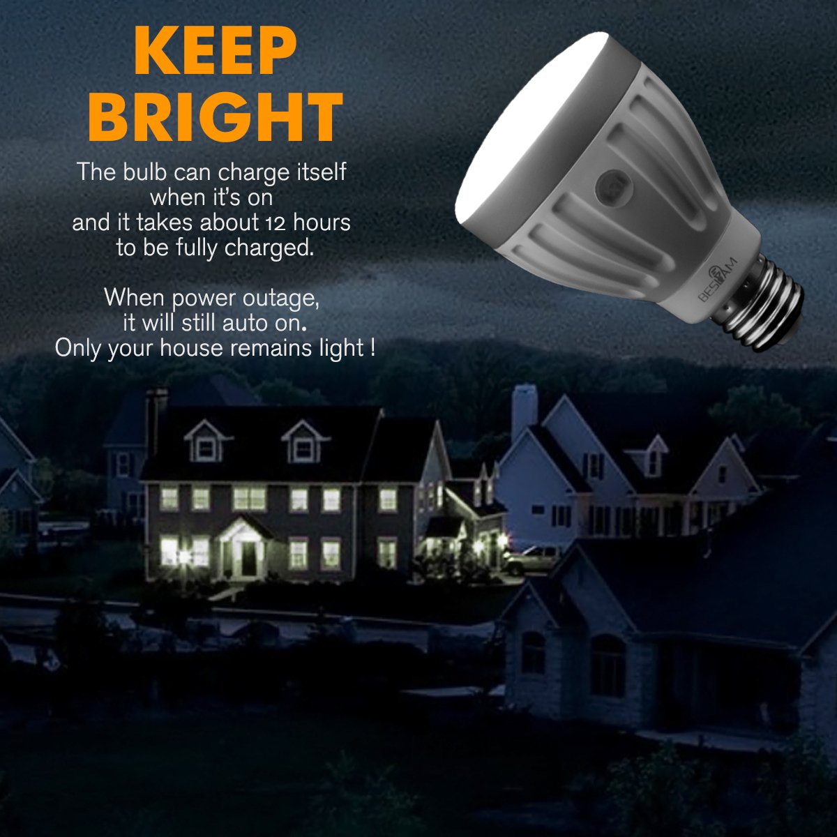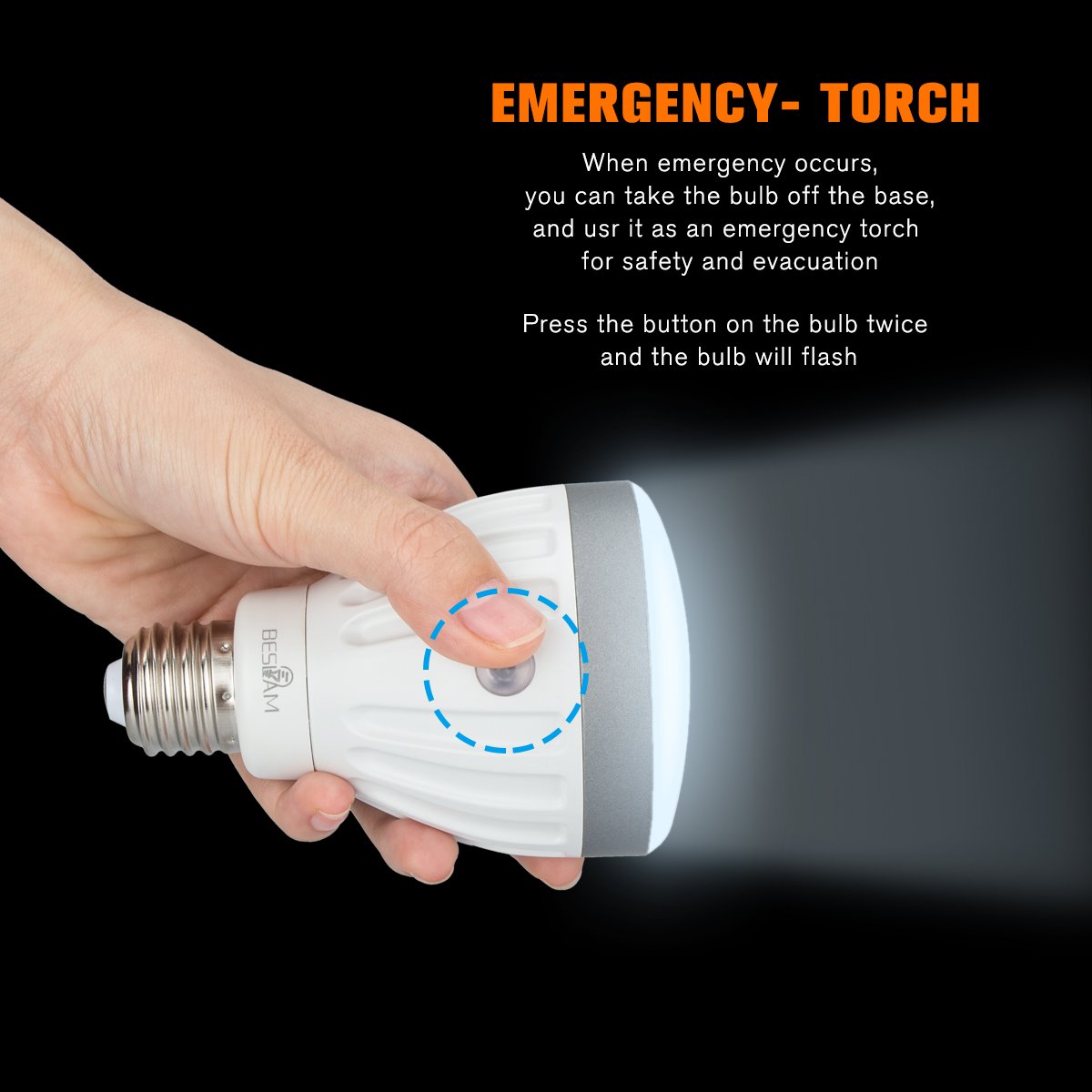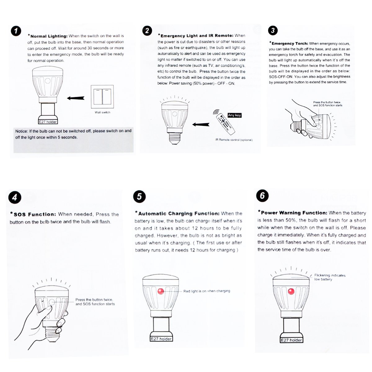 If the power outage occurs during lighting, the lightbulb will automatically detect power outage and switch to emergency mode and supply the built-in lithium battery for about 3 hours lighting