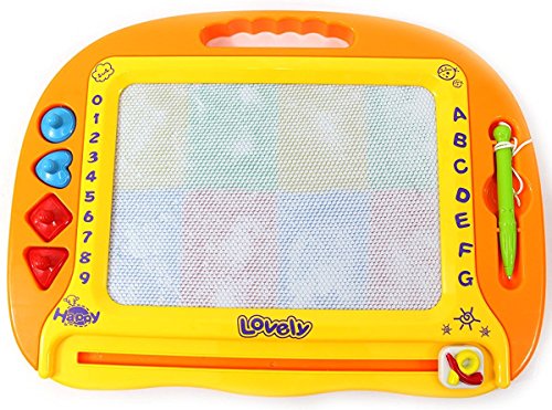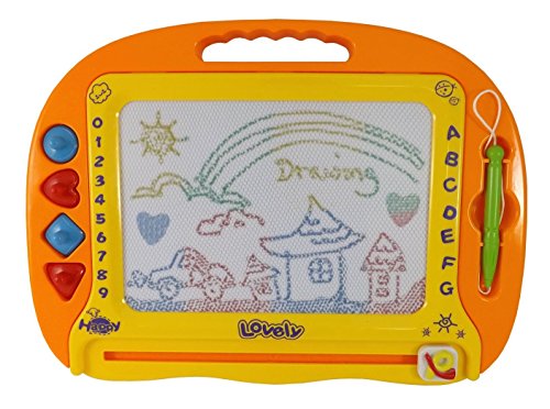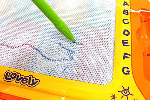 Hours of coloring fun! Magnetic drawing is more fun in color! Board comes with stylus and four shaped stamps. Frame is 15 x 11 inches and features a 9 x 6 inch drawing surface. Drawing area features 4 different colors: yellow, green, blue, red. Includes 4 shape stampers: circle, heart, square, triangle. Draw, play, write over and over and just slide with the eraser knob to clear the screen and start your creativity again. Perfect for play anywhere!