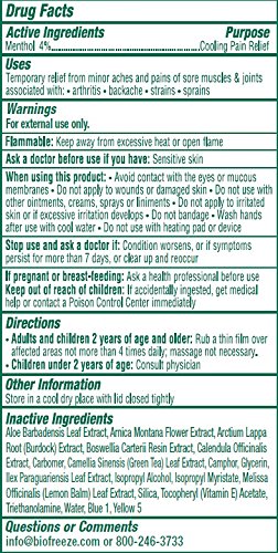 -. Feature : Biofreeze Pain Reliever is the #1 clinically used and recommended topical analgesic of hands-on healthcare professionals and for best results use in combination with their care (find one in your area on the Biofreeze website) / Chiropractors, physical therapists, massage therapists, podiatrists and athletic trainers use Biofreeze to provide immediate pain relief from many common conditions such as arthritis and other causes of muscle and joint pain / Biofreeze applies easily and penetrates quickly to relieve aches and pains related to sore muscles and joints, sprains, strains and bruises and can be applied for recovery to body parts such as the hand, wrist, elbow, foot, ankle, knee, hip, back, neck and shoulders / This legendary pain relief formula is NSAID-free, clinical research-proven, fast acting and long lasting, completely free of parabens and propylene glycol, made with USP grade ingredients, and available in both original green and dye-free versions / The 32 Ounce Gel Pump is particularly well-suited for massage applications on larger muscle areas that benefit from the hands-on approach and is recommended for practitioners who see between 80 and 180 patients per week