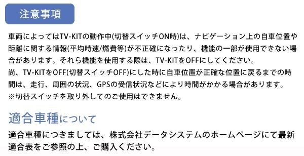 | セット内容 | TV-KIT本体 切替スイッチ 両面テープ 取扱/取付説明書 保証書(保証期間:3年、ユーザー保証登録カード付属) |