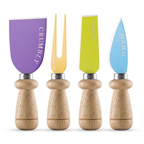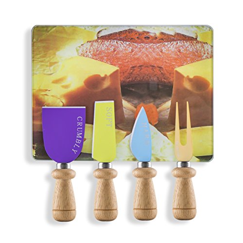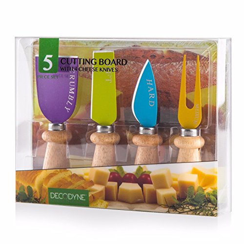 Each of the strong, sharp blades of the Decodyne Cheese Knife & Board Set has the name of the type of cheese that it's suited for printed on the blade in silver letters, making it easy to select the right knife for any type of cheese. The color coding simplifies things even further, letting you know which knife is which with just a glance. The tapered wooden handles allow the cheese knives to fit perfectly in your hand for ease of use every time.
