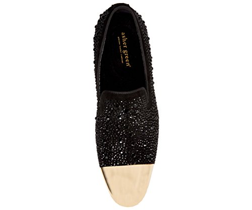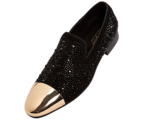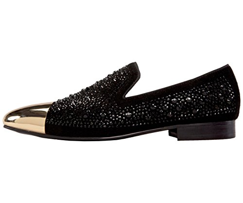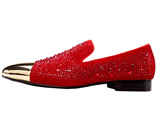Binding : Apparel Product Description All eyes on you: These crystal-encrusted genuine suede tuxedo smoking slippers with gold metal cap-toe are the ultimate statement-making dress shoe. Whether it's for the holidays, a special occasion such as prom, or simply for a night out, these eye-catching shoes are essential for elevating your entire outfit. The classic smoking slipper silhouette is completely covered in gleaming colored crystals and contrasting gold cap toe, giving this slip-on an eye-catching designer look. A low block heel and leather lining make these loafers comfortable to wear and easy to slip on. Take your look to the next level and add some major star power to your next night out on the town with these luxurious shoes. 0