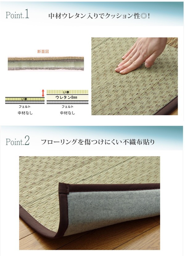 【素材】表地=い草 中材=ウレタンフォーム8mm 裏地=ポリエステル100%(不織布)※普通織 ヘリ=ポリエステル80%、綿20%