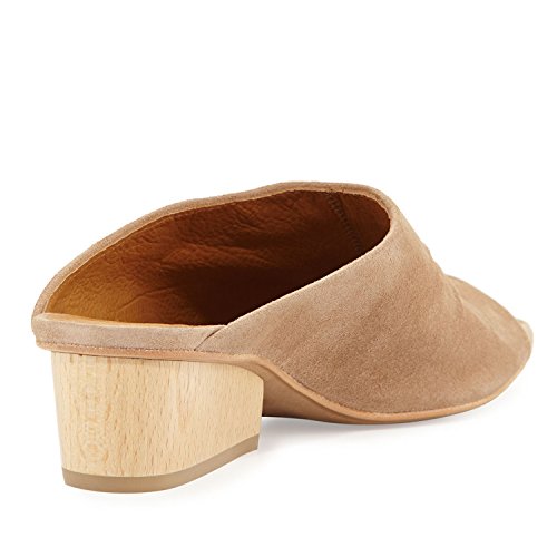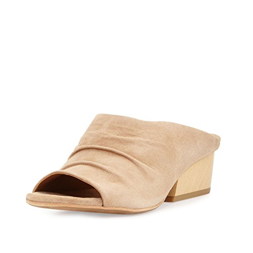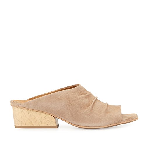 Product DescriptionA slip on mule sandal crafted from luxurious suede and features hand-draped ruching, sweetheart opening, and solid wood block heel.0