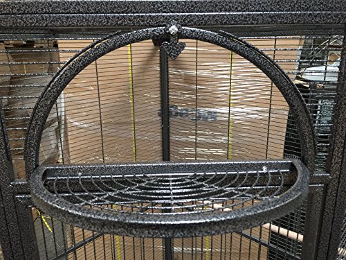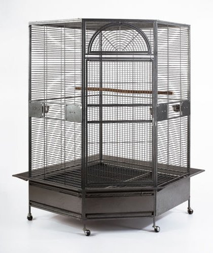 Studio : Mcage Publisher : Mcage Binding : Misc. Product Description Features: Space Saving corner design Large access door makes placing and removing your bird an easy task! Slide out grates for easy cleaning, keeps your bird safe inside. Sliding out removable tray for easy cleaning and waste removal. 2 Large wood perches. 4 Swing feeder gates with feeder bowls 360 degree surround seed skirt Cage features vertical and horizontal bars for your birds climbing pleasure. Powder coating finish, free from Zinc and Lead toxicants. Castors for easy moving about. Specification: Bar Spacing: 3/4" Bar Gauge: 1/4" Finish: Powder coating finish, safe from toxins harmful to birds Dimensions: 43 x 43 x 73"H (without seed skirt) Door size: H41-3/4" x W23" Included Accessories: Slide out tray: 2 Slide out grate: 2 Feeder Doors: 4 Feeder Cups: 4 Access doors: 1 Perches: 1 Ideal for: From small to large size birds: Budgies, Parakeets, Cockatiels, Lories, Love Birds, Parrotlets, Conures, Pionus, Senegals, Jenday,African Greys, Amazons, Large Cockatoos and Large Macaws, etc. 0