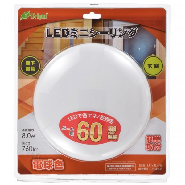 ボール球60形相当の明るさで、玄関、洗面所、廊下、階段などに最適です。光源は温かい電球色です。 製造国:中国 付属品:保証書付取扱説明書(保証期間:1年間) ※サプライヤー直送品 ご注文後2~3営業日後の出荷となります【商品名】OHM LEDミニシーリングライト 電球色 LE-Y8LK-W