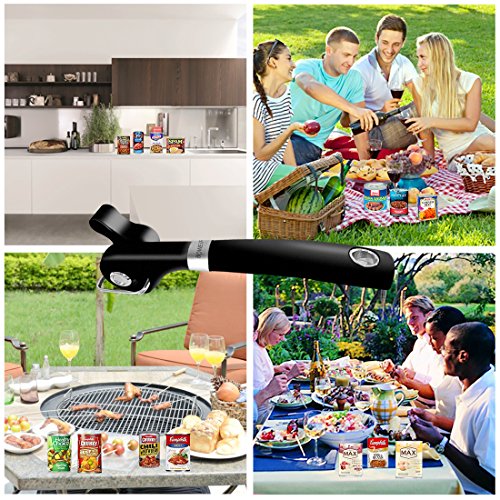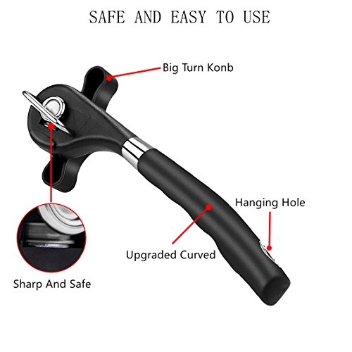 NEW UPGRADE MORE EFFORTLESS: Upgraded ergonomic curved handle, more comfortable than older versions, makes can opener cutting open cans more effortless, more fast and more simple. Even the children and the elderly can easily open canned