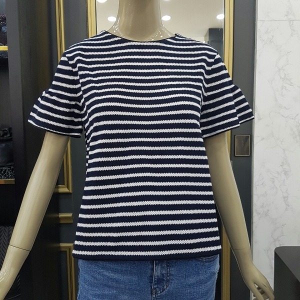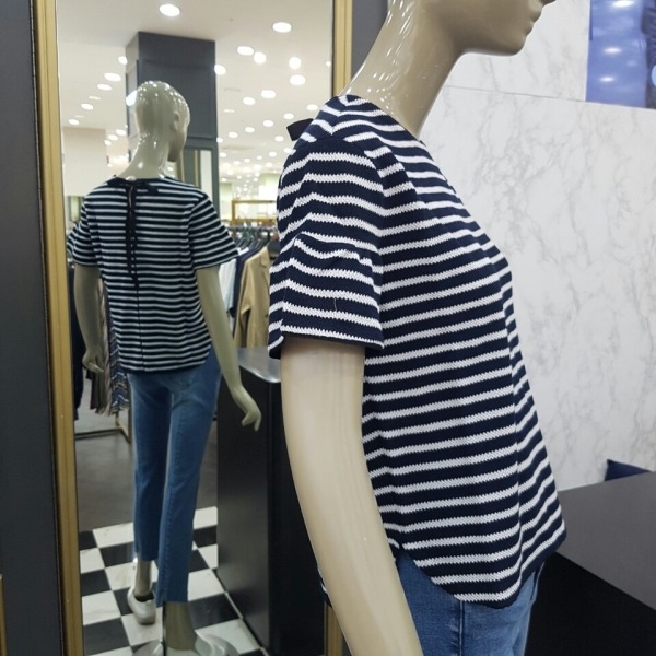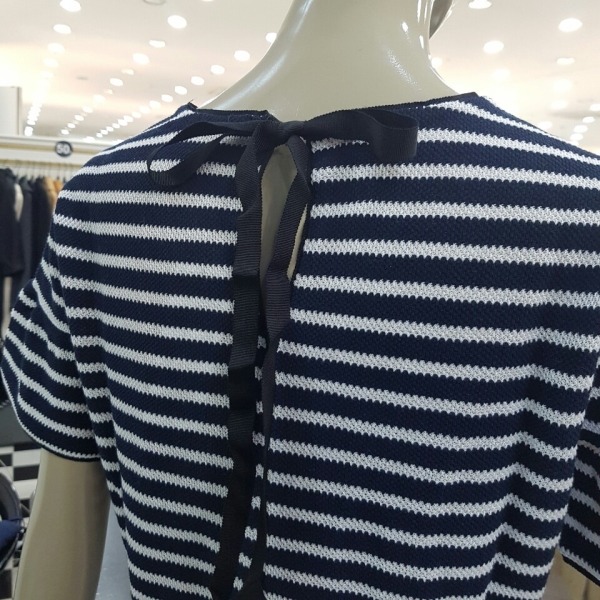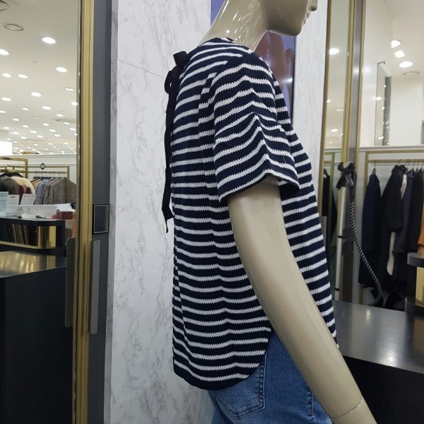 소매부분에 프릴 장식이 되어 있고 목선 뒤로 리본 장식으로 묶으면 귀여운 느낌을 주는 반팔 니트입니다