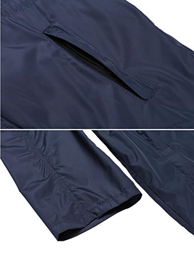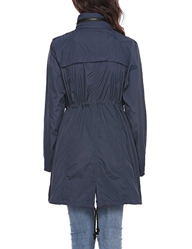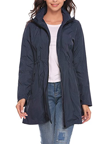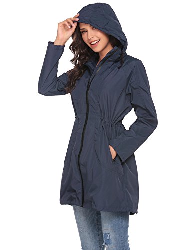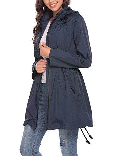 Elesol Women Lightweight Windbreaker Waterproof Long Rain Hooded Jacket with Drawstring Navy Blue/M