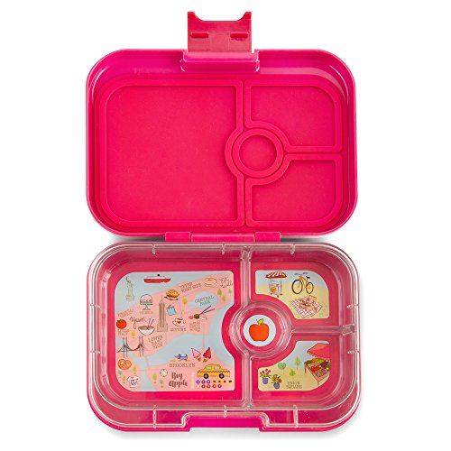 Perfect for kids and adults! 4 compartments (total volume 3 cups plus dip): One 2 cup portion for sandwich/salads, Two 1/2 cup sides, One 1 oz dip/treat well. Illustrated "NYC" Tray.