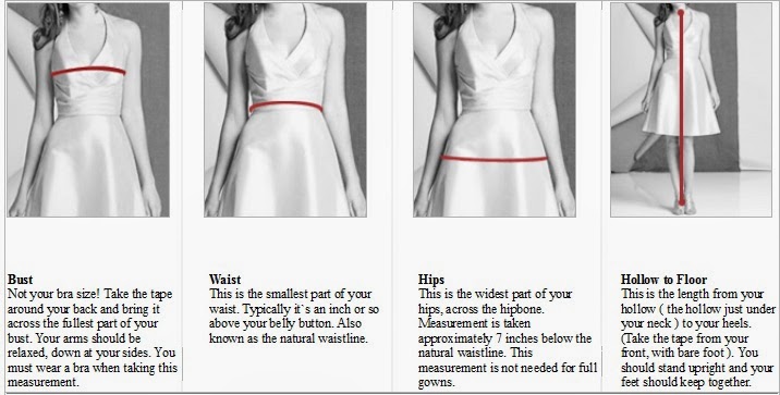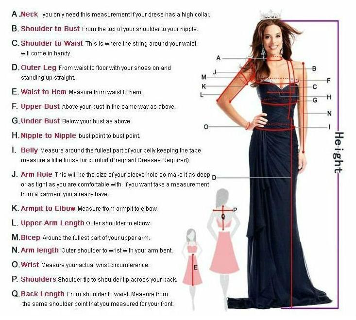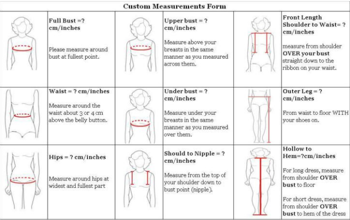 Required measurements 1. Full Bust: _____ CM/Inches 2. Under Bust: _____ CM/Inches 3. Waist: _____ CM/Inches 4. Belly: _____ CM/Inches 5. Hips: _____ CM/Inches 6. Hollow To Floor Without Shoes: _____ CM/Inches 7. Hollow To Hem: _____ CM/Inches 8. Height Of Shoes: _____ CM/Inches 9. Dress Closure (Zipper or Lace Up) _____ (Usually we recommend Zipper