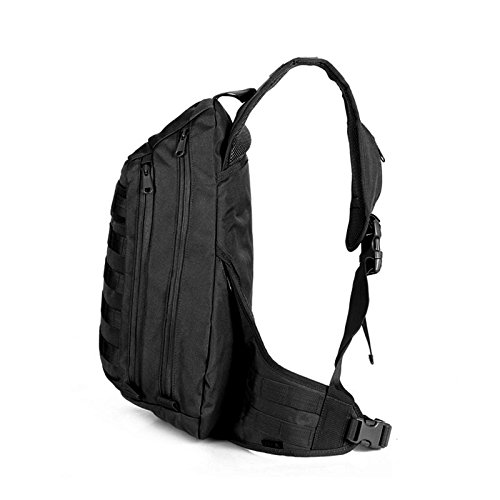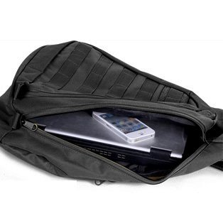 Ambidextrous shoulder/waist strap for left and right hand usage. Durable Zipper Pulls on ALL Three Compartments. - Compression Straps on Top and Side. Heavy Duty Webbing Over Entire Pack for Attachment.