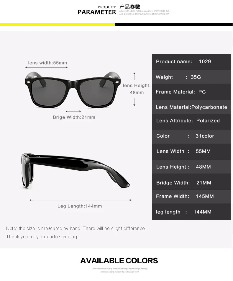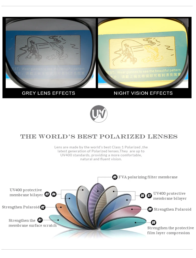 Lens Material:Polarize,100% UV 400 Protection against harmful UVA/UVB RAYS