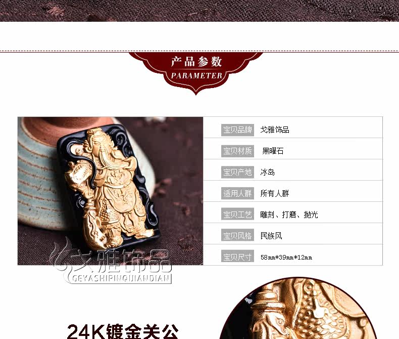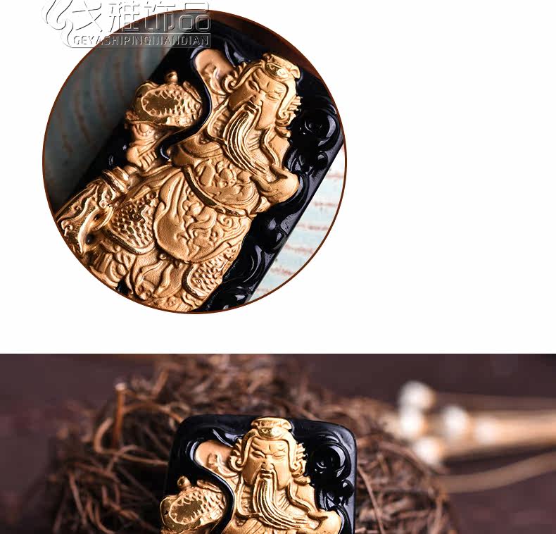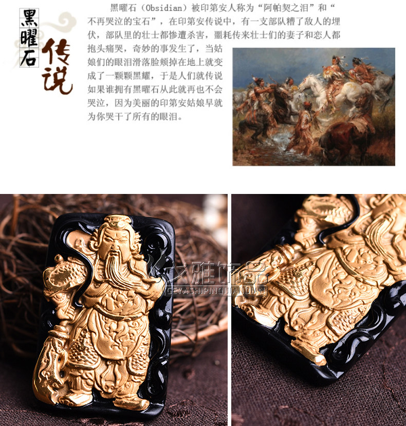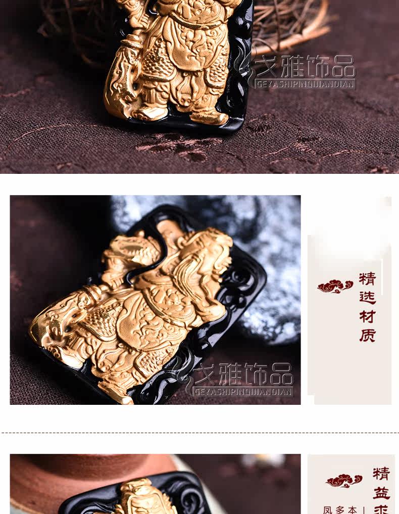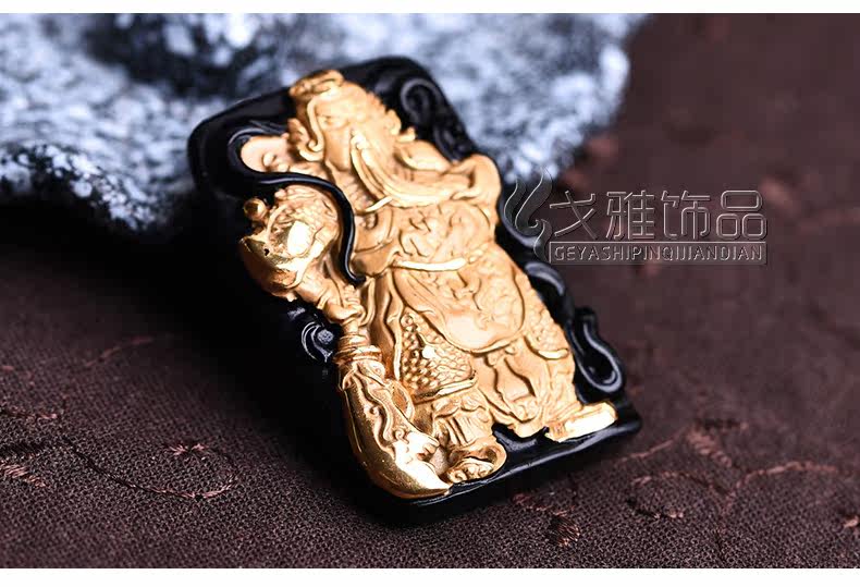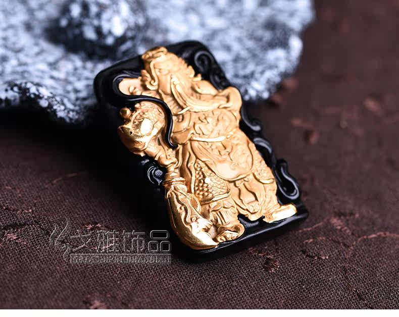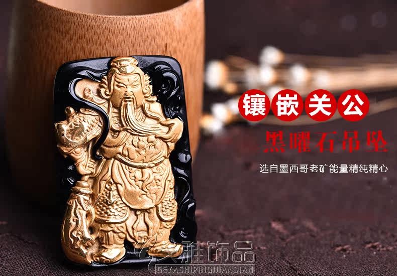 天然黑曜石乌金饰品威武关公 武财神吊坠 吊坠镶嵌合金男款