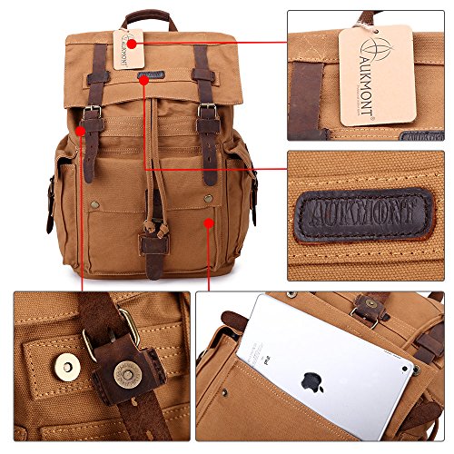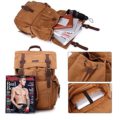 Feature : High Quality Canvas Backpack/ Rucksack/ School bag/Satchel. / Size: 34cm(L)*48cm(H)*18cm(W) /13.4"(L)*18.9"(H)*7.1"(W) / Vintage prewashed 2-tone blend cotton canvas. / Decorative buckles with high-efficiency magnetic button closures. / Large capacity, interior pocket is roomy for storing IPAD AIR, portable textbooks, A4 books etc, and have a special pocket fits 17 inch laptop.