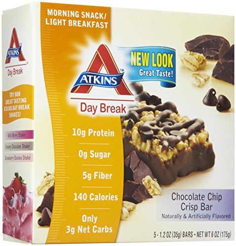 -. Binding : Health and Beauty -. Feature : Mornings have never been sweeter or more satisfying with this blend of chocolate chips, crisps, and a rich chocolate drizzle / Delicious, convenient, and nutritious way to stay satisfied until your next meal / Only 3.4 grams of net carbs and 0 grams of sugar per serving / 10 grams of protein / 5 grams of fiber -. Label : Atkins -. Manufacturer : Atkins -. PackageQuantity : 1 -. ProductGroup : Health and Beauty -. ProductTypeName : HEALTH_PERSONAL_CARE -. Publisher : Atkins -. Studio : Atkins -. Title : Atkins Day Break� Crisp Bar Chocolate Chip Crisp -- 5 Bars