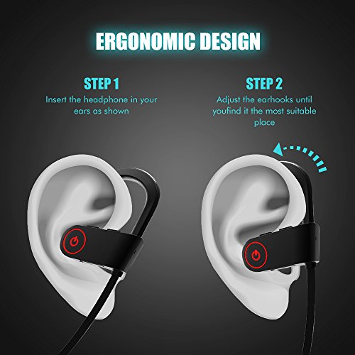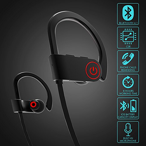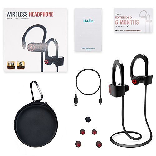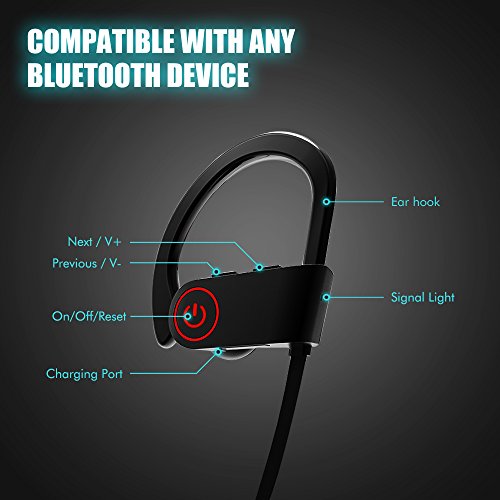 Details Decide The Quality: 1)Soft but not fragile Hooks comfort you while you using. 2)The cover of charging port has Stretch tape,which make the silicone cover durable. 3)Simple function keys control its multiple functions. 4)In-ear design can reduce most of the noise.Just enjoy your music. Specifications: Weight: 19.5g Lengh of Headphones Cable: 55cm/21.6in Sweatproof:IPX7 Simple and Modern Design Bluetooth Version: V4.1 EDR Battery Capicity:100mAh Stand-by time:about 250 hours Talking time Music playing time:6-8hours CE,FCC,Rohs,BQB Approved Operating Range: 10 Meters (33 Feet) Charging time: Within 2 hours Charging Voltage: DC 5V Package Included: 1 x Bluetooth Earphone 1 x USB Charging Cable 6 x Ear Buds (3 pairs) 1 x Clip 1 x User Manual 0