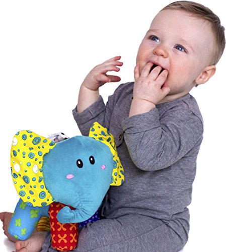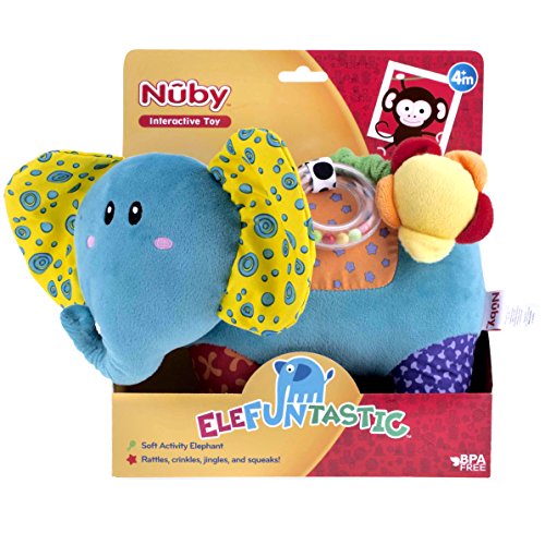 Nuby's new cuddly Elefuntastic plush toy features a variety of soft, tactile textures and vibrant colors to stimulate baby's senses. Tiny hands stay active with this colorful character as baby explores the soft crinkle ears, rattle ring and flower squeaker. Ideal for fun at home or on-the go.Feature