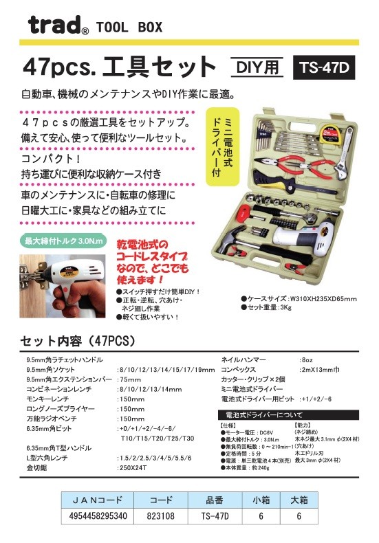 47PCSの厳選工具をセットアップ。備えて安心、使って便利なツールセット。コンパクト!持ち運びに便利な収納ケース付き。車のメンテナンスに・自転車の修理に・日曜大工に・家具などの組み立てに。電池式ドライバーについて… 乾電池式のコードレスタイプなので、どこでも使えます!スイッチを押すだけ簡単DIY!正転・逆転、穴あけ・ネジ廻し作業。軽くて扱いやすい。最大締付けトルク3.0N.M 仕様… モーター電圧:DC6V 無負荷回転数:0~210min-1 定格時間:5分 電源:単三乾電池4本(別売り) 能力… (ネジ締め)木ネジ最大3.1mm (2x4材) (穴あけ)木工ドリル刃 最大3mm (2x4材)