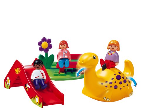 Playground comes with Rocking Dino and slide. This Playmobil 1.2.3 set includes three figures, grass, flower and park bench. Ages 18+ mths. Packaging: 12" x 8" x 3"