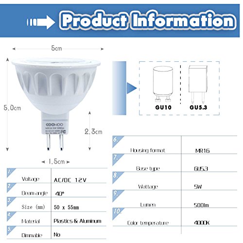 MR16 LED Light Bulbs with GU5.3 Base 50W Equivalent Halogen Replacement Neutral White 4000K 5W 12V UL Listed Spotlight with 500 Lumen 6 Packs By COOWOO