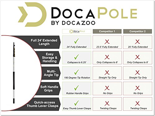 - EASY UPRIGHT EXTENSION AND USE – the DocaPole is easily extended straight up due to its short 6.25 foot retracted length, facilitating easy and safe extension indoors and in other tight places. Other long telescopic poles only retract to 8 feet and require extra room for horizontal extension before being turned upright