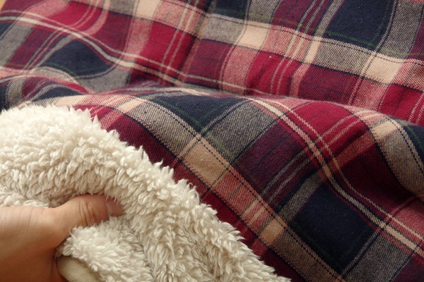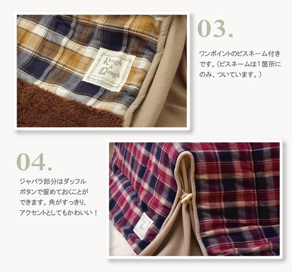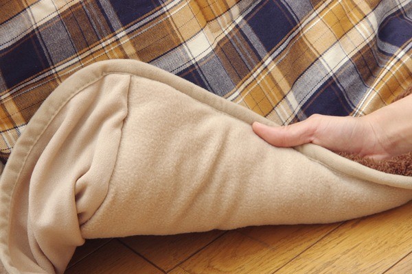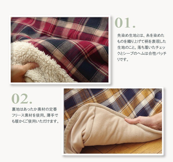 あたたかみのあるカラーと素材を使用したチェック柄のこたつ布団です。表地は綿100%です。綿はポリエステル素材に比べ静電気が起きにくく、繊維の中でも特に肌触りがよいのが特徴です。さらに糸を先に染色してから織る技法を採用しておりますので、プリントものや後から染色するものとは違う上質な雰囲気があります。裏地には軽くて保温性の高いフリースを使用しています。省スペースタイプで角が膨らまず、お部屋を広く使えます。薄手なので折りたたんでもかさばらず、コンパクトに収納できます。部分暖房のコタツは電気代もおトクです。