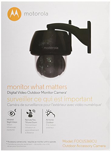 The focus360cu is a spare outdoor camera to add on to the focus360 for additional viewing angles in your outdoor space. The focus360 is a remote wireless baby monitor by Motorola that enables you to keep an eye on things both in and outside of your home. The convenient two-way communication feature on the indoor camera allows you to communicate with your little ones without being in the same room. This video monitor also showcases a 3.5" full color LCD screen, remote pan, tilt and zoom functionality and infrared night vision for keeping an eye on things in very low light levels both inside and outside your home. With this sophisticated video camera combo you're free to watch them dream and play.