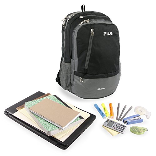 Studio : Fila Luggage Publisher : Fila Luggage Binding : Apparel Product Description Keep your gear or school supplies in one place in this 6 pocket laptop backpack. With enough room for your laptop, books, and accessories, you'll have everything you'll need to conquer the classroom. 12.5" x 10" x 18" 0