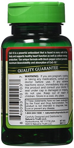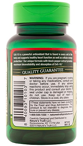 ReleaseDate : 2015-05-21 Studio : Nature's Truth Publisher : Nature's Truth Binding : Health and Beauty Product Description Co Q-10 is an important antioxidant that is found in every cell of the body and supports healthy heart function as well as cellular energy production. Our unique formula with black pepper extract provides maximum bioavailability and absorption of Co Q-10.These statements have not been evaluated by the Food and Drug Administration. This product is not intended to diagnose, treat, cure or prevent any disease. 0