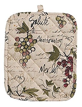 Potholder with design on front and solid quilted terry back side; measures 7 inches by 9 inches
