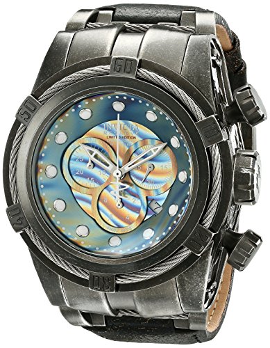 -. Feature : Chronograph functions with 60 second, 30 minute and 1/10 of a second sub dials; date window between 4:00 and 5:00; invite reserve 5-year warranty included with shipment / Grey, rainbow dial with silver tone and white hands and hour markers; luminous; unidirectional gunmetal stone distressed ion-plated stainless steel bezel with stainless steel wire accent; stainless screw-down crown; limited edition; flame fusion crystal; gunmetal stone distressed ion-plated stainless steel case; black distressed leather strap / Swiss-quartz movement / Case diameter: 51mm / Water resistant to 660 feet
