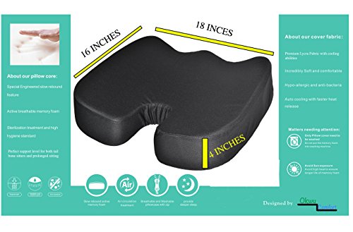 -. Feature : High-density memory foam that reduces pressure on the coccyx, tailbone and hipbones while sitting. / Great for traveling in cars, planes, trains, buses, wheelchair, office chair, bench, S.T.A.R.B.U.C.K.S, patios, sport games, chairs, and outdoors. / Ergonomically and patented design promoting healthy weight distribution, posture and vertebral alignment. You will not be disappointed. / Promotes comfort, assists in relief and avoiding lower back pain, numbness, and pressure sore / Reliable material and cushioned foam with removable velour cover machine washable and allows for easy cleaning. Removable and washable cover; 5 year warranty