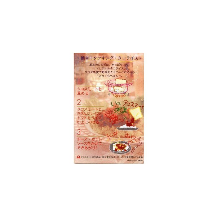 【원재료】:【타코스 미토】식육(쇠고기,돼지고기)고, 야채(타마 파,마늘)고, 간장,향신료,설탕,과립 이고,식염,조미료(아미노산등)고,(원재료의 일부에 젖,밀을 포함한다)【핫 소스】토마토 소스,토마토 Paste,자《라피노퓨레》,당류(과당 포도당액당,설탕)고, 타마 파,향신료,신맛료,증점제(로우 캐스트 bean 껌)고, 조미료(아미노산등)고, 향료,(원재료의 일부에 밀,젖,대두,쇠고기,닭고기,돼지고기를 포함한다)