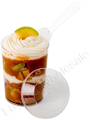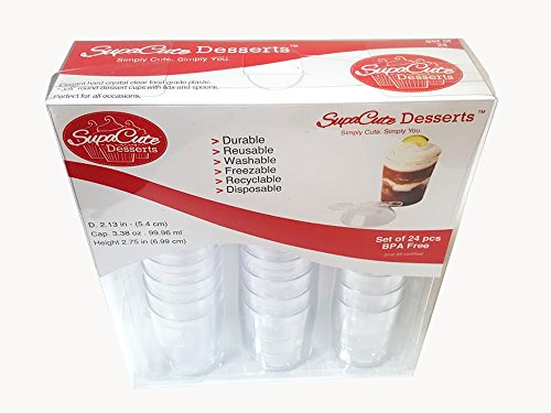 -. Feature : SupaCute Desserts (TM). Clear plastic dessert cups with snap lid food containers and mini tasting spoons set of 24 parfait glasses with 24 lids and 24 serving spoons. Capacity 3.38 ounce. These dessert cups are made from hard crystal clear food grade plastic BPA free, disposable, reusable, washable, recyclable durable and freezable. Height: 2.75 inch, top diameter 2.08 inch and bottom diameter: 1.77 inch. / Elegant round shape tumbler cups set of 24 count used as tiramisu cups or pudding cups, 24 count parfait spoons or appetizer spoons and 24 count lids used also as small appetizer plates. They are the perfect party and household supplies for baby showers, new year's eve, retirement, carnival and much more. / Great dessert bowls and jello shot cups with lids which the lids can be used as dessert plates or catering plates as well as appetizer plates for hors d'oeuvre, tiny food party and for your candy buffet. / The most popular verrine size and shape food containers dessert glasses and parfait cups in catering supplies. These parfait glasses and jello shooter cups are the ideal catering dishes and party cups for your chocolate mousse, yogurt parfait, pudding, semifreddo, jello shots and any mini desserts. / 30-DAY MONEY BACK GUARANTEE & PROMO: See promotion below for your discount when purchasing 2 or more SupaCute Desserts (TM) clear plastic dessert cups with snap lid food containers and mini tasting spoons set of 24 parfait glasses, 3.38 oz. Promotion applied automatically at the time of purchase. Get yours now!