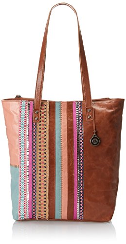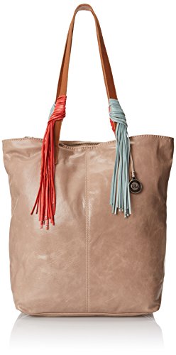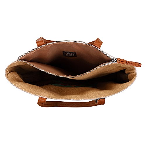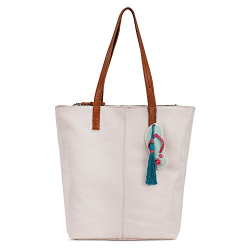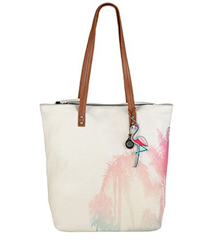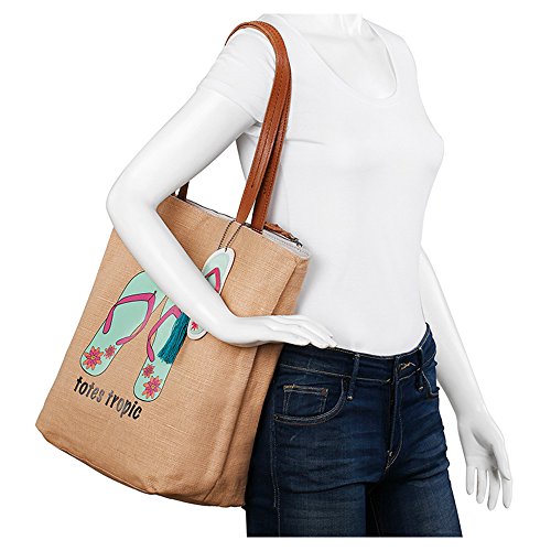 The fun, cheeky prints on this reversible leather and canvas totebag will take you from workday to beach day with ease. Magnetic snap closure Matching removable keychain and tassel Top zipper pocket Reversible leather and canvas.