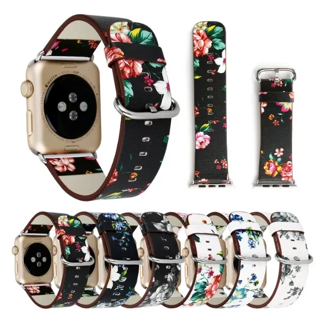 상품 내용 국가 블랙 화이트 꽃 인쇄 가죽 시계 밴드 스트랩 시계 꽃 디자인 손목 시계 팔찌 iwatch I212