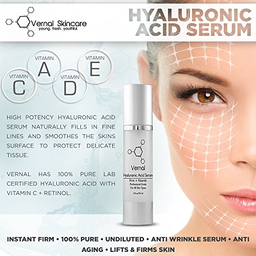 -. Title : Vernal Skincare - Best Hyaluronic Acid Serum With Vitamin Vitamin C, A, D & E, Instant Firm, Pure, Undiluted - Anti Wrinkle Serum, Anti Aging - Highest Quality Hyaluronic Acid Serum, Potent Anti Aging Serum - Lifts and Firms Skin. Net Wt 2.0 oz/50ml