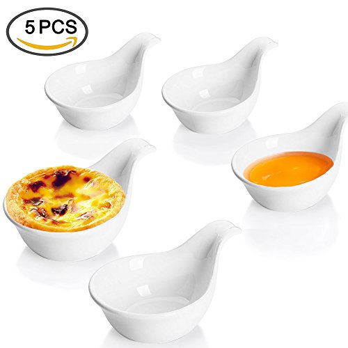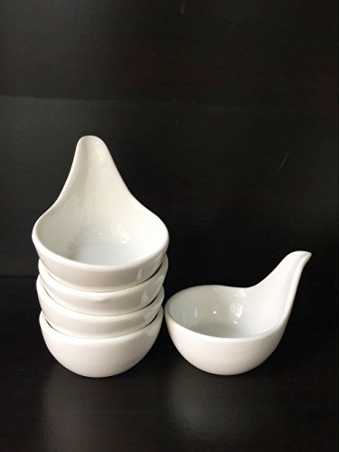 leoyoubei 2oz Ceramic pickles /Porcelain Dipping Bowls/ caviar / dessert / appetizer and other spices spoon style tableware 2.75".Stackable Ramekins with Grip Handle 5 pack white