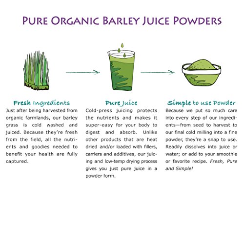 Energizing, Chlorophyll-Rich Health Tonic: Our CO2 low temp-dried Organic Barley Grass Juice Powder preserves this impressive superfood in a vibrant, pure powder. At the peak of nutrition, our emerald green grasses are harvested, juiced, and dried into a fresh powder that's a cinch to mix in juice, water, or your fave smoothie. Organic Barley Grass Juice Powder is your convenient go-to for green grass nutrition - no juicing required.Barley Grass Juice: A Nutritional Goldmine; Our young, tender, and vibrant emerald green blades of organic barley grass are harvested at the very zenith of their nutritional potential. They are then immediately and carefully juiced and dried under very low temperatures, removing all of the impossible to digest cellulose that our stomachs were simply not designed to handle (we aren't cows or horses after all!), while concentrating all the nutrition. Along with chlorophyll and hundreds of live enzymes, grass juice is infused with all twenty amino acids, making it a complete source of plant-based protein. And let's not forget the jam-packed roster of vitamins and minerals tucked inside, like vitamin K, beta-carotene, and iron. What doesn't the precious juice of these grasses contain?! Many of grass juice's known cleansing and healing effects are due to its abundant chlorophyll content. Grass juices, when grown and processed with special care like we use, are also bursting with bioactive enzymes. One in particular is superoxide dismutase, or SOD, and it is indeed a "super" hero when it comes to protecting cells from free radical damage. Another rare natural enzyme is P4D1, a potent enzyme for healthy cell repair. Organic Barley Grass Juice Powder is truly one of nature's most perfect superfoods, offering a revitalizing spark to anyone's day!Feature