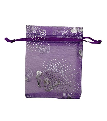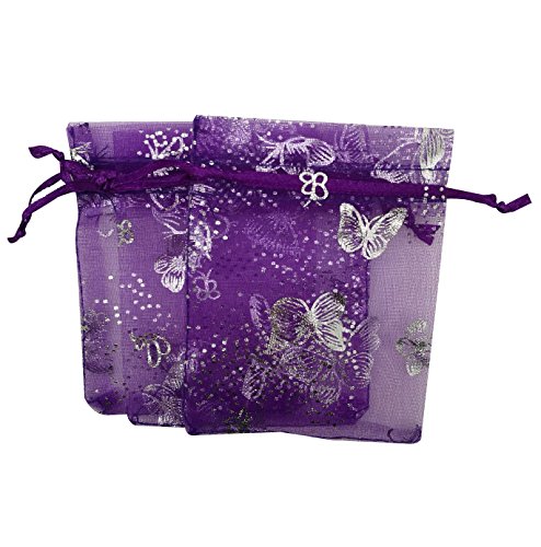 SUNGULF 100Pcs Sheer Organza Drawstring Pouches Deep Purple Butterfly Wedding Gift Bags 3x4 Inches