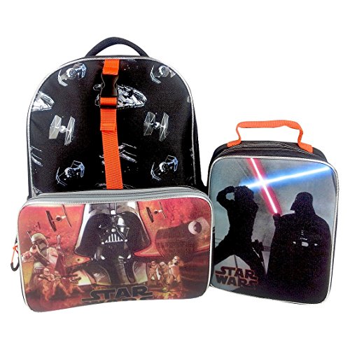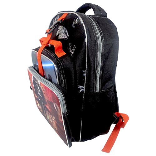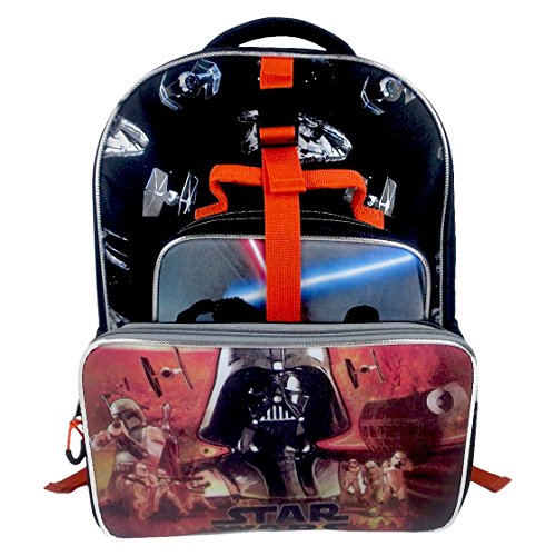 Made by Fast Forward. Features include: NO PVC, Easy to detach matching lunch tote, Full size 16" backpack, Insulated lunch tote, Comfort padding, Padded adjustable should straps, Zippered backpack holds 3-4 books with ease, Hanging loop and 2 mesh side pockets. This backpack has it all. Great Star Wars themed design featuring Darth Vader and Stormtroopers.