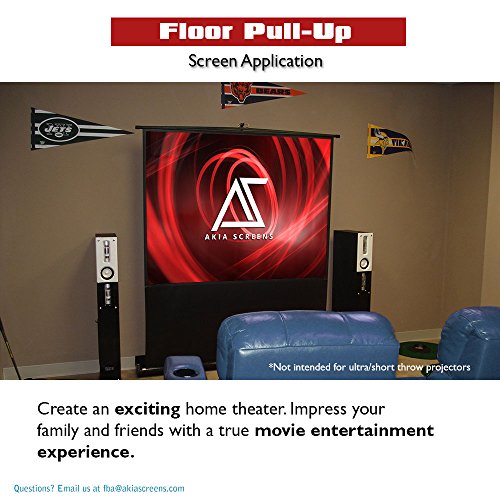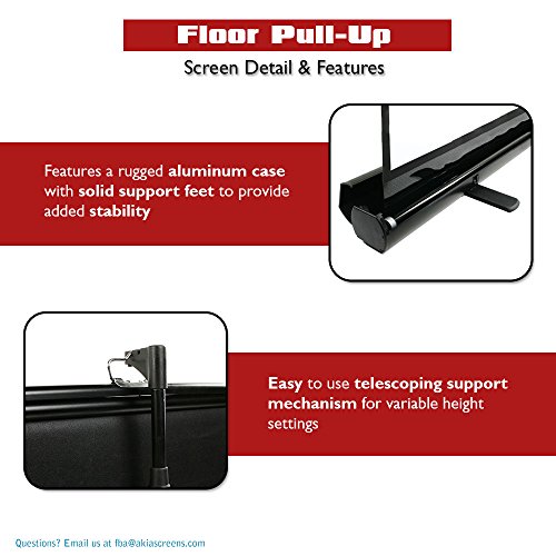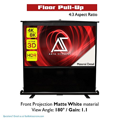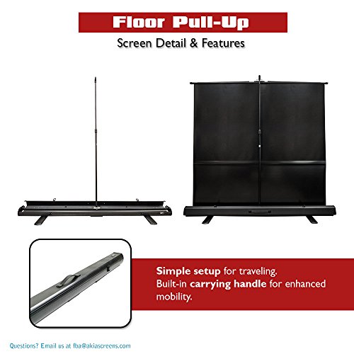 AKIA SCREENS ? Floor Pull-Up Projector Screen is perfect for any home, office, or business. ? The super easy to use?functionality of this screen allows the user to pick the perfect height for their presentation and maxes out at an impressive 60 inches diagonally. ? Features a crisp lightly textured matte white screen with a 180-degree viewing angle for a bright and vivid image from anywhere in the room.? ? The Screen sets up in minutes by simply adjusting the expanding rod and twist locking it at the desired height to achieve multiple aspect ratios. This projection screen also has feet for easy balancing and prevents the screen from getting knocked down.