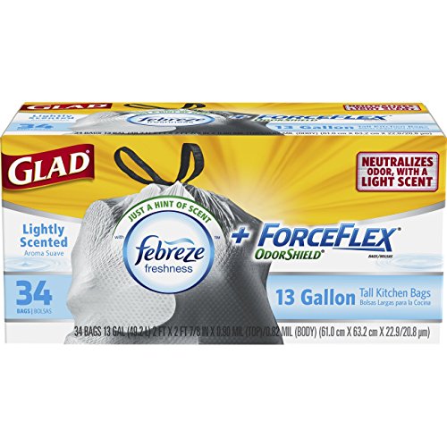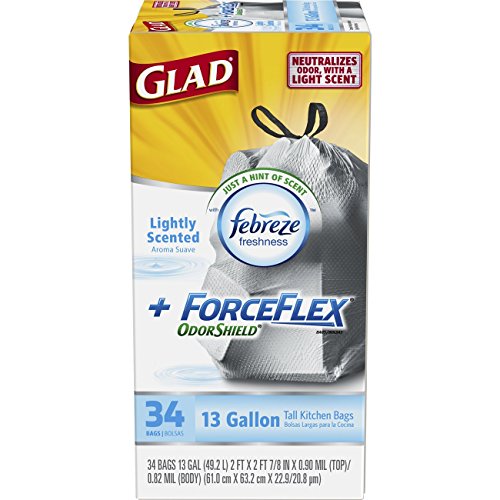 ReleaseDate : 2015-06-08 Studio : Glad Publisher : Glad Binding : Health and Beauty Product Description Lightly Scented, Glad ForceFlex OdorShield Trash Bags provide strength plus long lasting odor neutralization to keep your home smelling fresh and clean. These kitchen garbage bags are made with OdorShield technology and Febreze freshness to provide continuous odor neutralization, based on time lapse test evaluation. The unique diamond texture of Glad's ForceFlex technology in these drawstring bags, prevents rips and tears. The trash can liner stretches around objects to protect against punctures, leaks and trash messes. With the 3 ply drawstring, which grips the can, the trash bag stays in place until you are ready to take it out. The drawstring bag makes closing and carrying easy. These 13 gallon size, odor eliminating, trash bags, are lightly scented and fit tall kitchen trash cans and are perfect for use in busy kitchens, offices or seasonal cleaning like Spring Cleaning and Back to School. 0