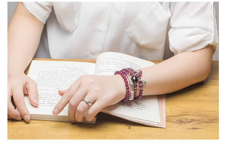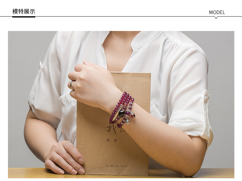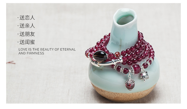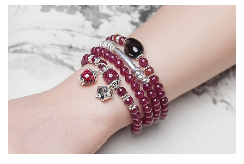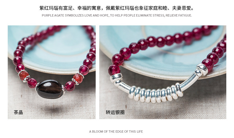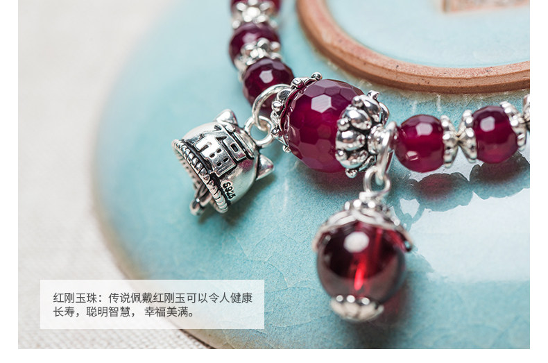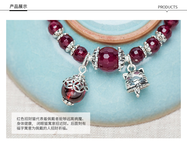 原创紫红玛瑙水晶手链女多圈925银首饰招财猫手串节日礼物