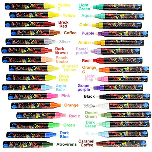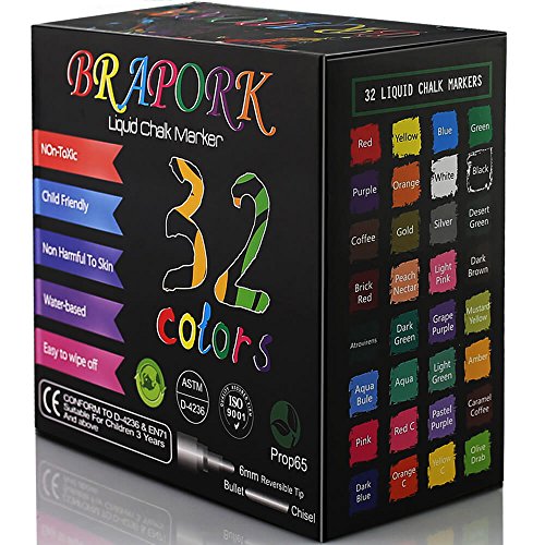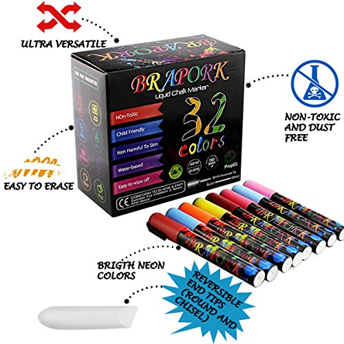 Brapork Liquid Chalk Markers [ Pack of 32 Color ] - For Chalkboard Signs, Blackboards, Glass, Windows, Car Doodle