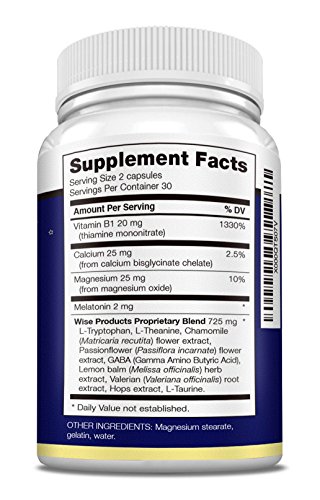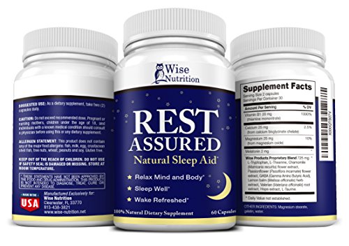 -. Binding : Health and Beauty -. Brand : Wise -. Color : Smokey Blue -. EAN : 0641378058882 -. Feature : ALL NATURAL INGREDIENTS, NON HABIT-FORMING AND DRUG FREE. Nature provided the perfect ingredients and we blended them into Rest Assured so you can fall asleep fast and have a calm, deep sleep. Sleep soundly with our blend of melatonin, minerals and herbs and fast-acting L-Tryptophan and L-Theanine, the feel good amino acids! Our herbal blend includes Chamomile, Passionflower, Lemon Balm, Valerian root and Hops to gently relax the body and mind and provide the good night's sleep you deserve. / RESET YOUR BODY CLOCK AND SAY GOOD-BYE TO RESTLESS NIGHTS AND INSOMNIA. No grogginess, heaviness or other side effects that can occur with prescription sleeping pills. Our added B1, calcium and magnesium help calm the mind and reduce racing thoughts that can take over at night. Get the relaxing sleep you need to rehabilitate the body, mind and soul! / WAKE UP REFRESHED AND ALERT IN THE MORNING. Rest Assured works with your body naturally to help you gently drift off to sleep and stay asleep, the way nature intended so you have the energy and mental focus needed for your day ahead. / WISE NUTRITION'S PROPRIETARY BLEND WAS RESEARCHED AND MANUFACTURED TO OUR SPECIFIC FORMULA. We took the time to put together an exact formula that works for YOU so your sleep is restful and rejuvenating! Lab-tested to ensure quality. Our product contains no additives, buffers or fillers. Just pure, natural and effective. / WE STAND BEHIND OUR PRODUCT AND WANT YOU TO HAVE RESULTS. We offer a money back guarantee if for any reason you are not satisfied. But we're certain you will be! Made in the USA in a licensed Good Manufacturing Practices (GMP) and FDA approved facility. Click on BUY NOW and REST ASSURED! -. IsAdultProduct : 0 -. Label : Wise Naturals -. LegalDisclaimer : CAUTION: Do not exceed recommended dose. Pregnant or nursing mothers, children under the age of 18, and individuals with a known medical condition should consult a physician before using this or any dietary supplement. Do not use if safety seal is damaged or missing. Store at room temperature. *These statements have not been approved by the food and drug administration. This product is not intended to diagnose, treat, cure or prevent any disease. -. Manufacturer : Wise Naturals -. MPN : 000 -. PackageQuantity : 1 -. PartNumber : 000 -. ProductGroup : Health and Beauty -. ProductTypeName : HEALTH_PERSONAL_CARE -. Publisher : Wise Naturals -. Size : none -. Studio : Wise Naturals -. Title : Natural Sleep Aid Pills to Fall Asleep Fast with Melatonin, Amino Acids, Minerals and Herbal Blend - Non-Habit Forming - End Insomnia and Sleep Deprivation! 60 Caps -. UPC : 641378058882