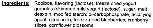 -. Feature : Mahamosa Blueberry Yogurt Tea 2 oz - Rooibos Herbal Loose Leaf Tea Blend Delicious rooibos herbal tea! / Rooibos tea, flavoring (lactose), freeze dried yogurt granules (skimmed mild yogurt (lactose), sugar, malt desxtrin, modifed starch: di-carbophosphate, acidifying agent: citric acid), freeze-dried blueberries, cranberry slices, cornflower blossoms. / Good any time. / No caffeine / Being in the World®: Mahamosa donates 50% of after-tax net profits to charity!