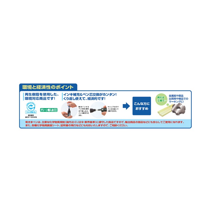 재생 수지를 사용했다, 환경 대응 상품입니다.본체,캡,미마개에,재생PP(폴리프로필렌)수지를 사용하고, 에코 마크에 인정되어 있습니다. 또한 유성 마커 독특한 냄새를 억제했다, 사람에게 부드러운 알코올계 잉크를 사용 하고 있습니다.